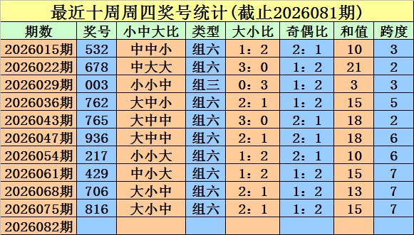 奖号类型判断:近期周四组六显着活跃,近十周开出9次,上周四为组六,组三出现较少,本周四看好在组六。