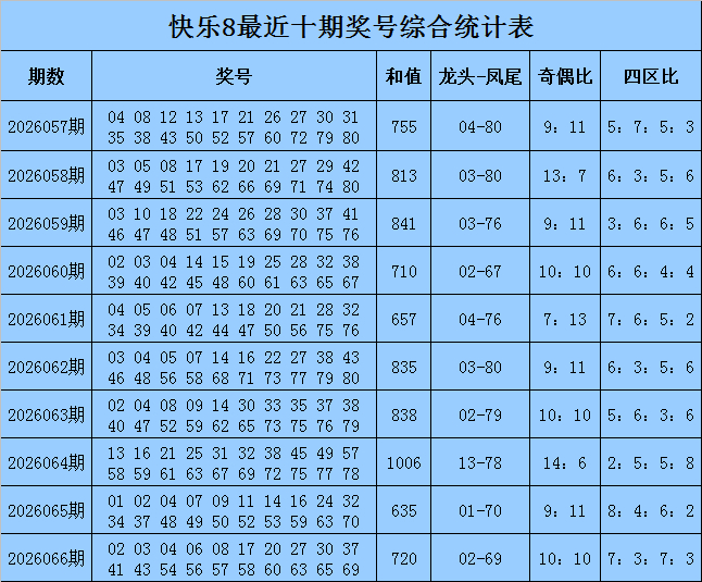 福彩骄矜8第2026066期开奖回来:02 03 04 06 08 17 20 27 30 37 41 43 54 56 57 58 60 63 65 69,其中奖号和值为720,跨度为67,奇偶比开出10:10,012路比开出9:4:7,四区比开出7:3:7:3。