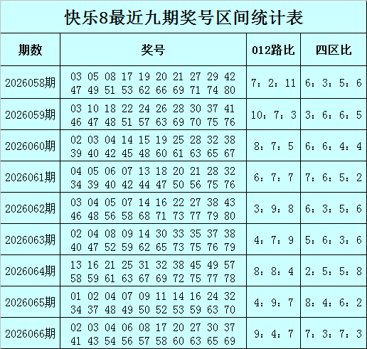 福彩自傲8第2026066期开出奖号:02 03 04 06 08 17 20 27 30 37 41 43 54 56 57 58 60 63 65 69,其中奖号012路比为9:4:7,四区比为7:3:7:7。