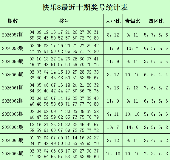 福彩振奋8第2026066期开奖回归:02 03 04 06 08 17 20 27 30 37 41 43 54 56 57 58 60 63 65 69,其中奖号四区比为7:3:7:3,奇偶比为10:10,大小比为10:10。
