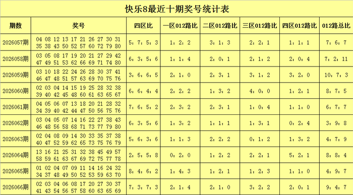 福彩闲适8第2026066期奖号为:02 03 04 06 08 17 20 27 30 37 41 43 54 56 57 58 60 63 65 69,其中奖号012路比为9:4:7,奇偶比比为10:10,大小比为10:10,五区比为5:4:3:6:2。