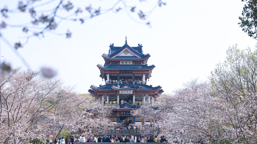 鼋头渚地标赏樱楼前东谈主头攒动。