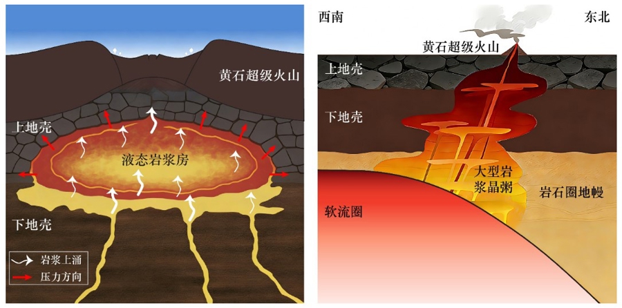以往臆测合计,超等火山的能源起原是其下方地壳内的液态岩浆房——低密度岩浆逐渐麇集到岩浆房内,并捏续加多对围岩的压力,最终导致地壳发生大规模闹翻、垮塌和岩浆喷发。论文通信作家、中国科学院地质与地球物理臆测所刘丽军臆测员说,但越来越多的臆测发现,纯液态岩浆房并不存在,超等火山的能源起原更可能是纵跨所有这个词岩石圈的大型岩浆晶粥。