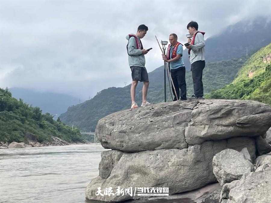 申学良(中)和共事在赤水河滨测量。