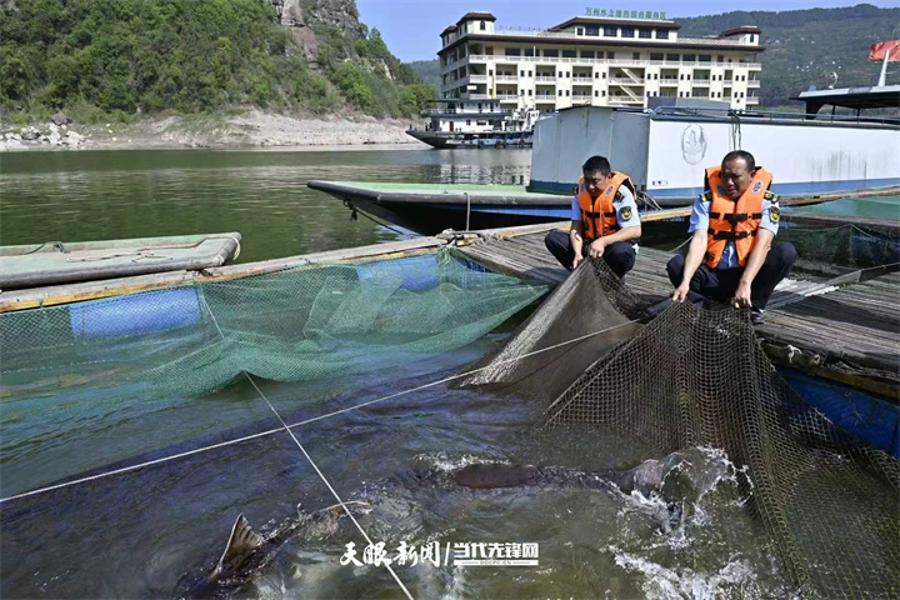 重庆万州水产商议所大周基地东说念主工鱼场,万州农业轮廓行政功令支队的队员在盘货胭脂鱼和长江鲟种鱼数目。张春晓 摄 (视觉重庆)